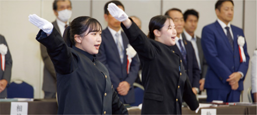 続いて応援団長の宮武奈穂さん(4年・中国)、副団長の武富玲奈さん(3年・英米)、元応援団長の松下小夜子さんのリードに合わせ、参加者全員で懐かしい校歌を斉唱。締めくくりに大学の発展を祈って「フレー、フレー、北九」の元気いっぱいのエールが送られると会場から拍手が湧いた。