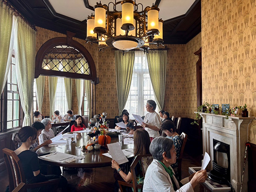 今回のお店「貴賓館」は、天神中央公園の一角に佇む洋館で明治時代に来賓接待所として建てられ、それから百余年、国の重要文化財にも指定され今もなお明治時代の古き良き歴史情緒を感じる貴重な建造物として親しまれています。その貴賓館が偶然にもカフェとして利用できることを知り即予約しました。MAX23名の貸し切り、満員御礼!