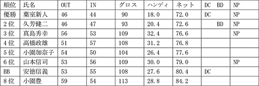 敬称略 BB=ブービー賞 DC=ドラコン賞 BD=バーディー賞 NP=ニアピン賞