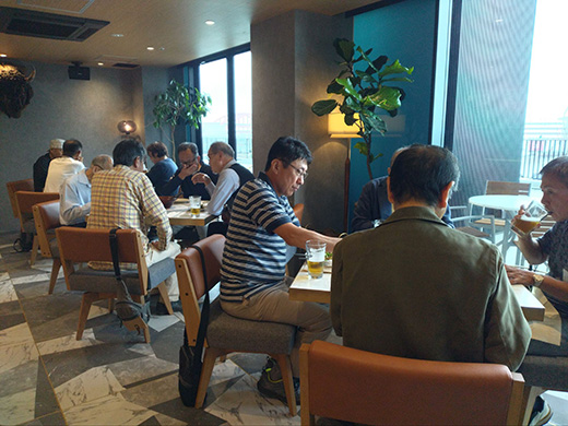 2時間の会食終了後、全体としての交流不足を補うべく、お店の前のテラス席で、2次会(?)へ。車座形式に椅子を並べ替えて、1人ずつ、趣味をメインに自己紹介。マラソンやゴルフといったスポーツや家庭菜園、旅行から、仕事に邁進まで、それぞれに充実した日常生活の様子が感じられました。