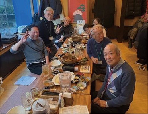 新年会は久しぶりに市中の居酒屋レストランに場所を移したが、多彩な料理や飲み物に加え80代から20代という幅広い年齢層が醸し出す現役時代のコンパを思い起こすようなワイワイムードで盛り上がっていった。