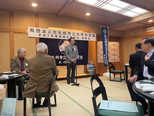 同窓会本部の土田会長と北九州市立大学学長の柳井様にご参加いただき、総勢37人が出席しました。副支部長の尾崎様(平成11年経営情報科卒)の司会進行により、私が挨拶を述べた後、柳井学長に北九州市立大学の近況報告を兼ねたご挨拶をいただき、続いて土田会長にもお話をいただきました。