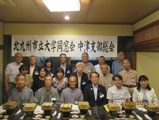 中津支部総会・懇親会を7月11日、和風味処「鬼太郎」にて開催しました。コロナ禍を経て7年ぶりの総会には、来賓として、大学から後藤副学長、本部より権頭副会長,松田幹事長、小出理事にご出席いただきました。